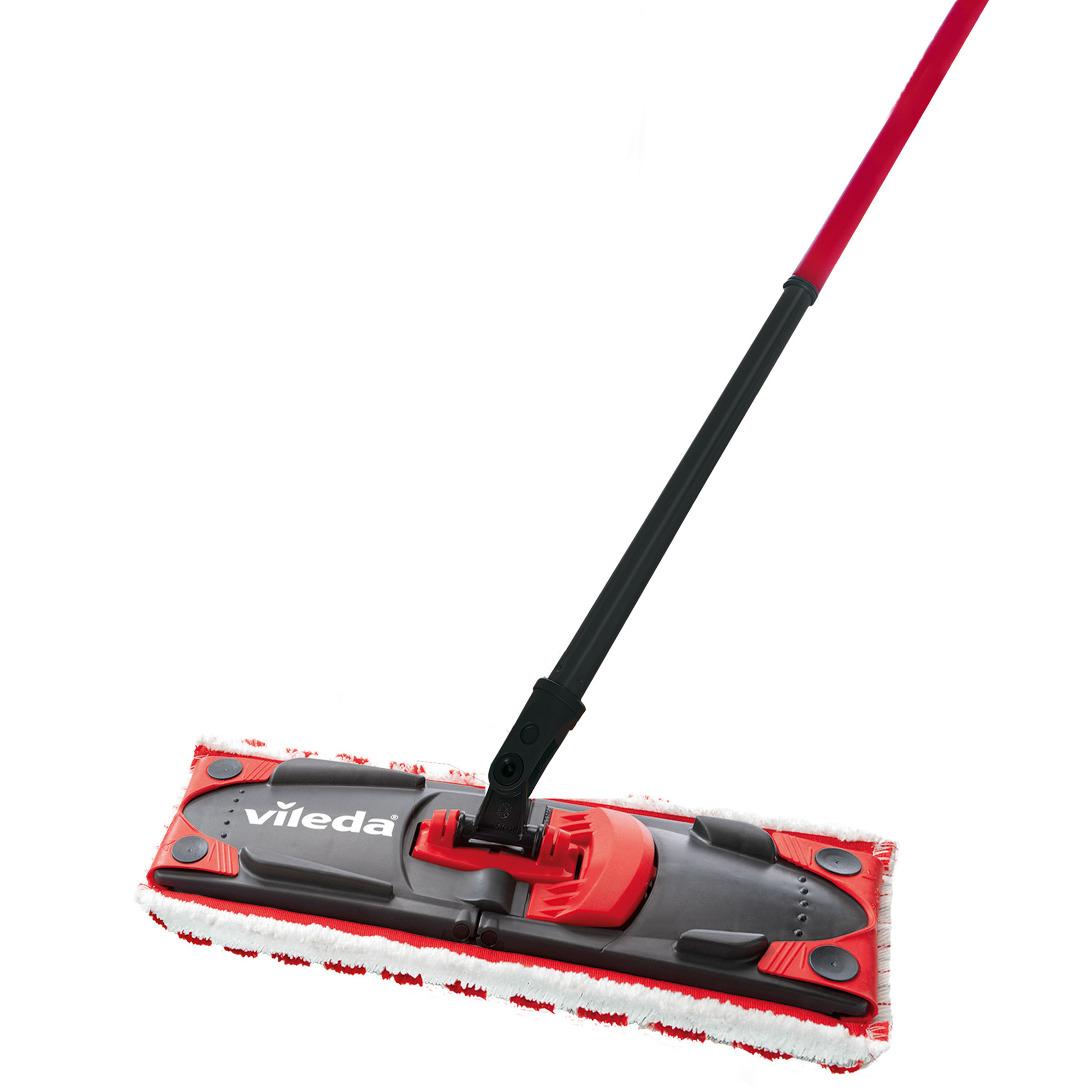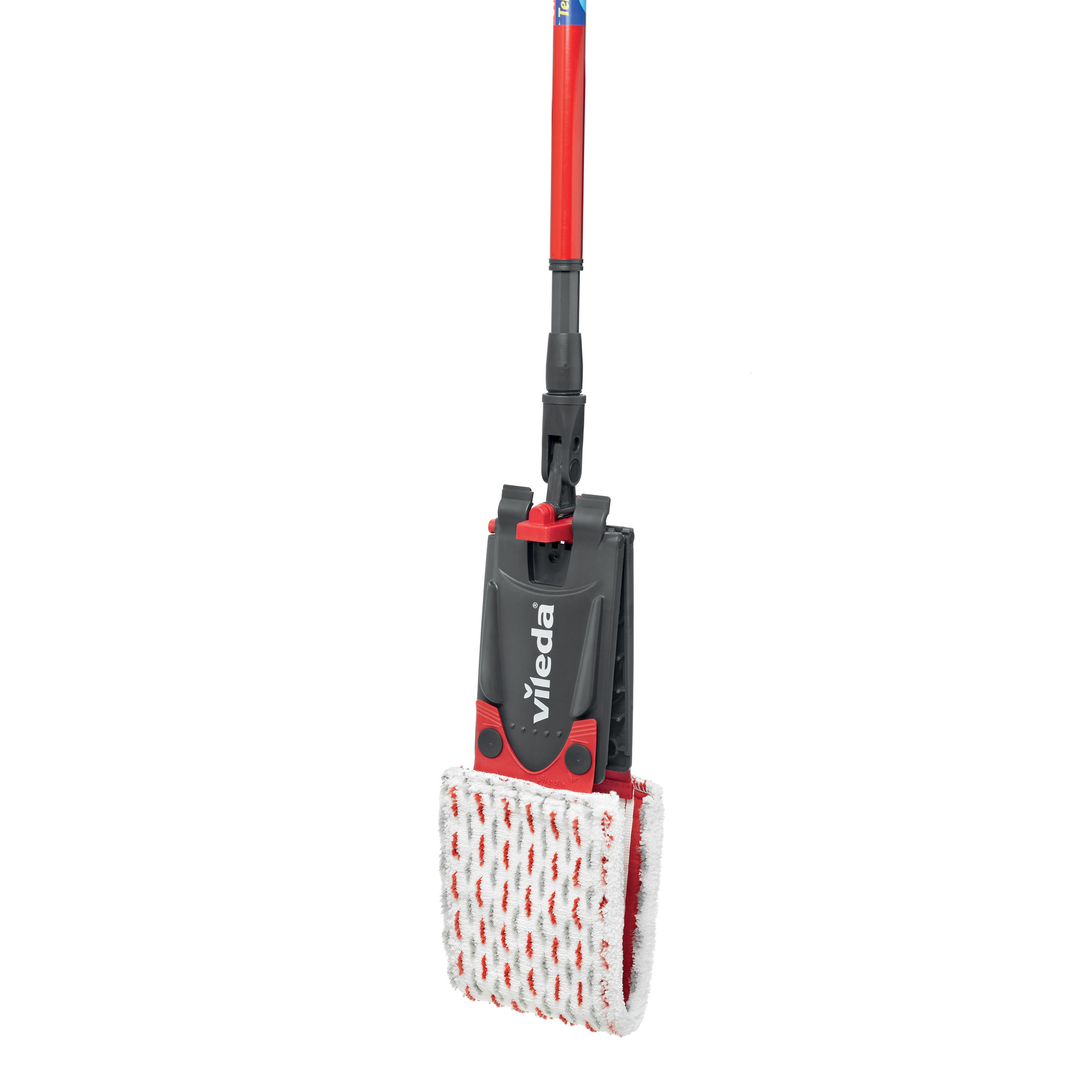 Mop płaski Vileda posiada przycisk na padzie, który umożliwia szybkie złożenie mopa, poprzez kliknięcie stopą, w celu wypłukania wkładu w wiadrze.