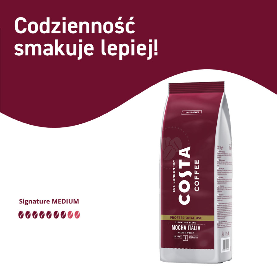 - kultowa mieszanka Arabiki i Robusty znana z kawiarni COSTA COFFEE (wyważone palenie)